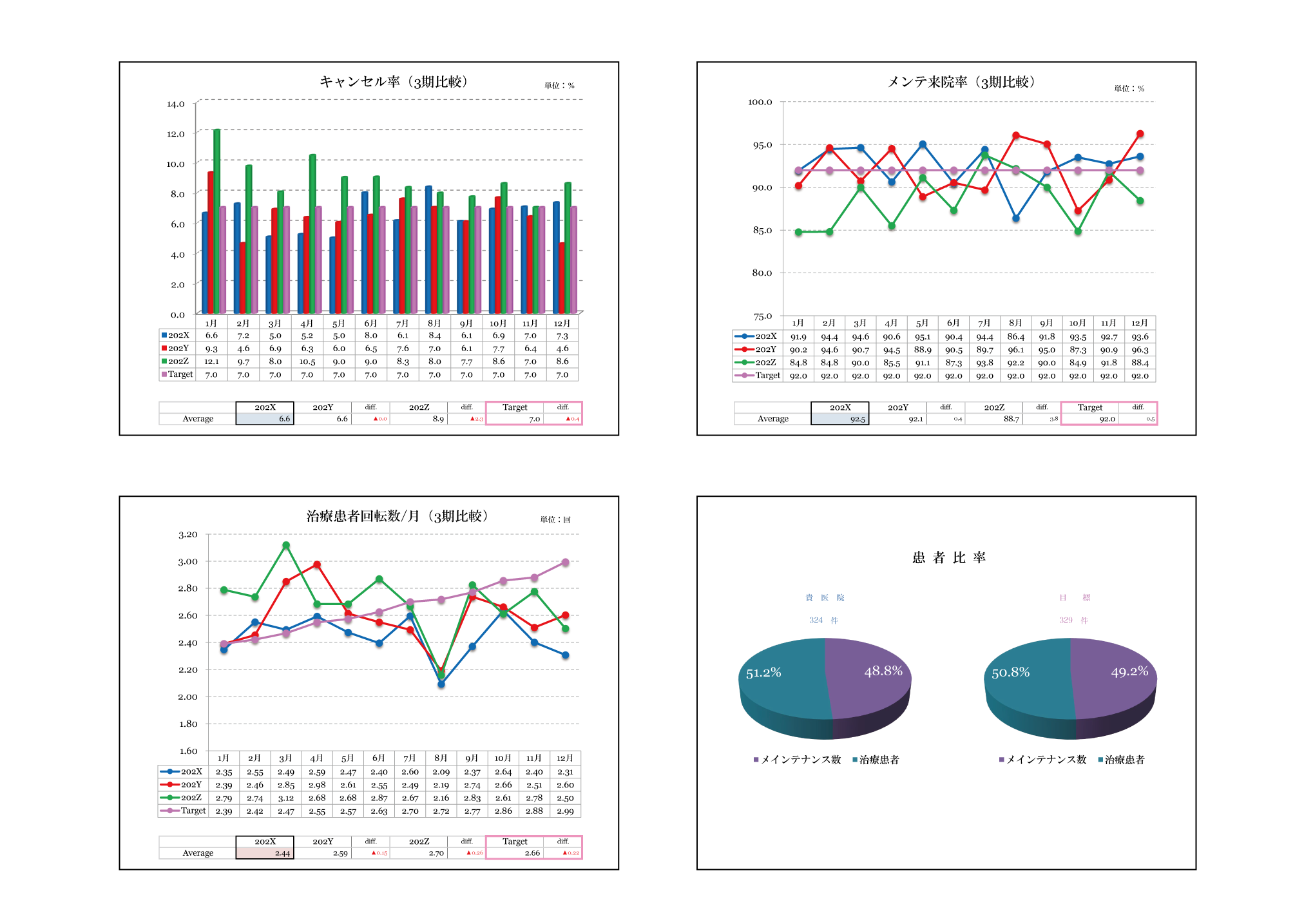 入会2か月目からは、当社独自の分析項目を追加したレポートをお届けします。治療患者とメンテ患者の適正な比率等、レセコンでは集計できない数値が分かります。