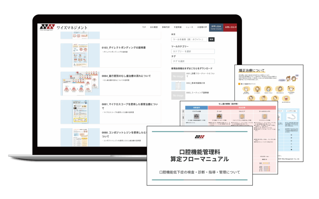補綴のメニュー表やカウンセリングマニュアルなど、現場ですぐに使えるツールが会員専用サイトからダウンロードし放題!