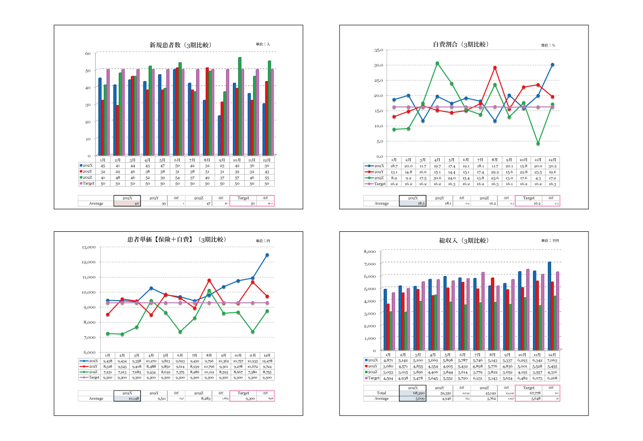 新患、自費率、患者単価など、重要指標15項目を過去3年間の月別グラフで可視化。どこにボトルネックがあるか、データから売上頭打ちの真の原因を特定します。