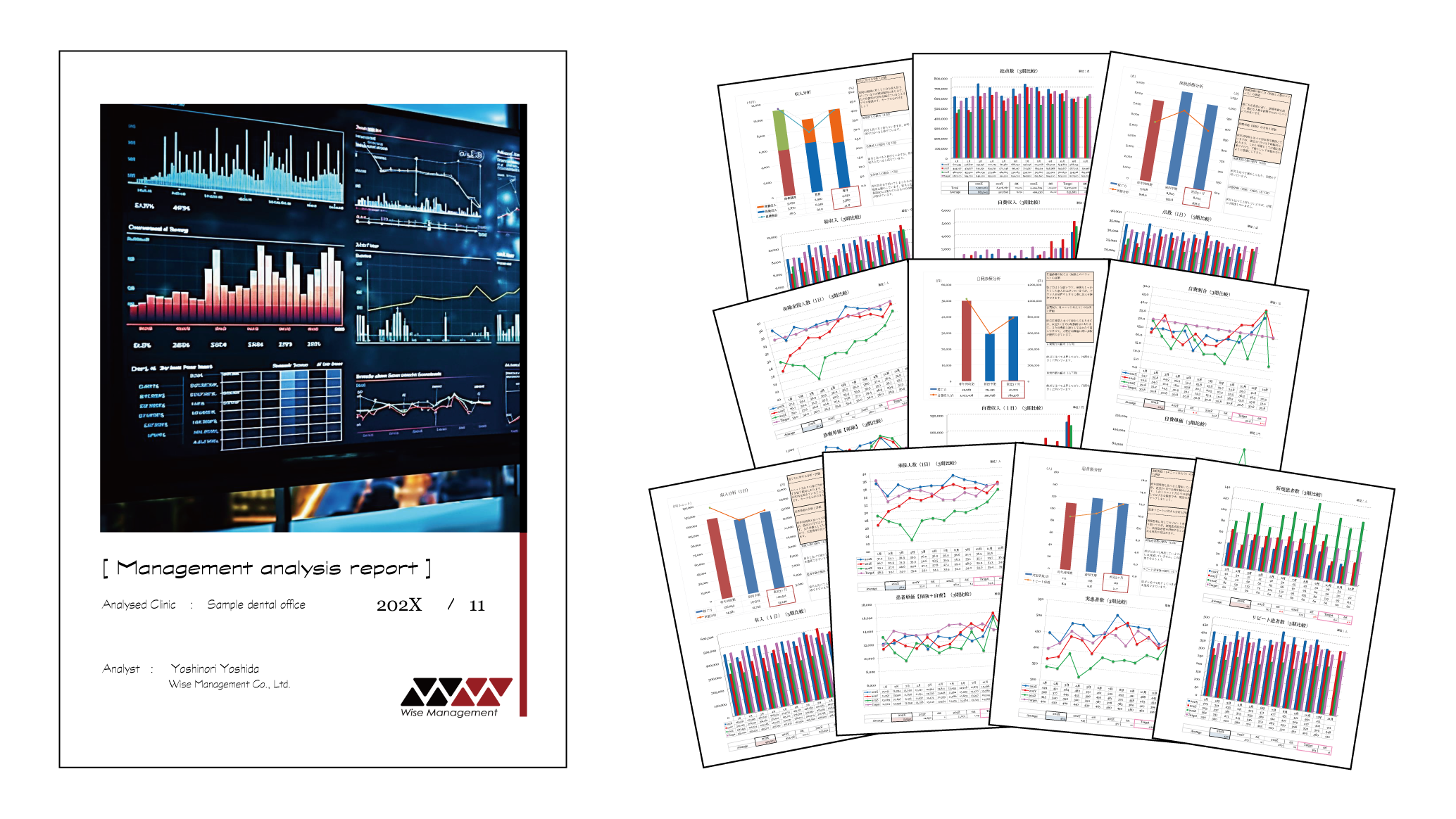 2回目以降は、治療とメンテ患者割合の適正値や治療患者の回転数など、当社独自の分析項目を含む計23項目の完全版レポートを毎月お届けします。