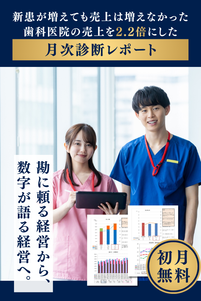 Dental Solutionベーシックプランは、当社独自の数値分析とツール提供の2つで歯科医院の経営をサポートするサブスクサービスです。20年で300院以上を支援してきたノウハウが詰まった診断レポートとツールを、まずは初月無料でお試しください。